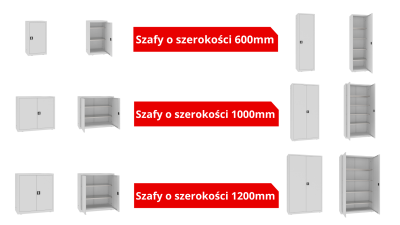 Szafy s膮 dost臋pne w sze艣ciu wariantach z drzwiami pojedynczymi i podw贸jnymi, wszystkie o g艂臋boko艣ci 435 mm. Wyst臋puj膮 w szeroko艣ciach 600, 800 i 1200 mm oraz w dw贸ch wysoko艣ciach: 1040 mm i 1990 mm. Paleta 16 kolor贸w RAL oraz mo偶liwo艣膰 pomalowania drzwi w innym kolorze ni偶 korpus pozwala na stworzenie a偶 256 unikalnych kombinacji kolorystycznych.